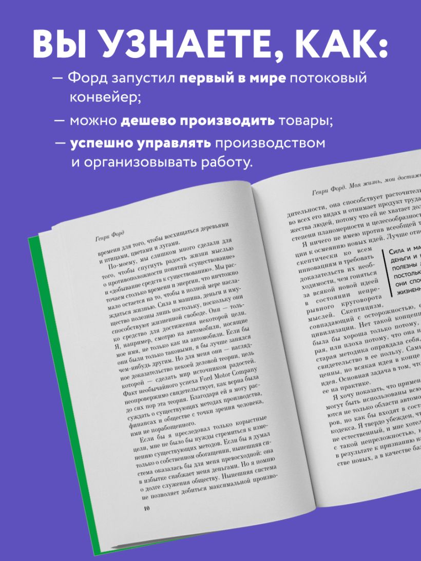 Генри рассуждает о мотивации рабочих и управлении заводом, о банковской системе и военных заказах кратко, но доступно. Читается не как учение «акулы бизнеса», а как откровение простого парня, который хочет делать работу хорошо.