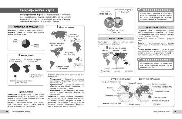 Пособие поможет быстро и эффективно подготовится к урокам, различным формам текущего и промежуточного контроля, а также к экзаменам. В книге в наглядной и доступной форме приводятся основные сведения за весь школьный курс географии. В громоздких учебниках порой бывает сложно найти ответ на какой-то конкретный вопрос. А в данном издании представлена действительно нужная и систематизированная информация, материал изложен последовательно, от простого к сложному, дополняется иллюстрациями, примерами, наглядными схемами и таблицами. В этой книжке для школьников можно найти все основные разделы предмета: «География как наука», «Природа Земли и человек», «Население мира», «Мировое хозяйство», «Природопользование и экология», «Регионы и страны мира», «География России». Справочник обеспечит знание и понимание всех, даже самых сложных тем школьной программы. В нем каждый ученик 5-6-7-8-9-10-11 классов найдет много полезного для своего образования, обретет уверенность на уроках, контрольных, ОГЭ и ЕГЭ. Пособие окажет помощь родителям во время занятий с детьми.