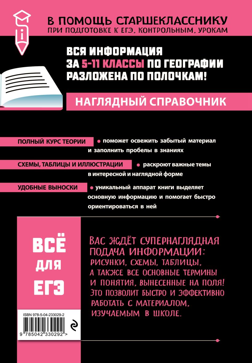 Пособие содержит подробную информацию по теоретическим и практическим аспектам разделов "География как наука", "Природа Земли и человек", "Географическая оболочка Земли", "Особенности природы материков и океанов", "Население мира", "Мировое хозяйство", "Природопользование и экология", "Регионы и страны мира", "География России". Теоретические блоки сопровождаются иллюстрациями, схемами и таблицами для лучшей систематизации знаний и усвоения материала.