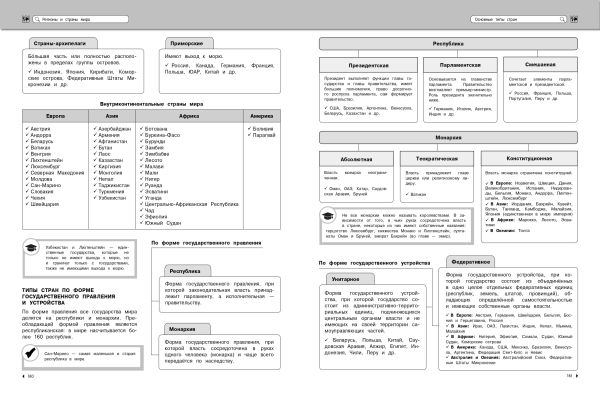 В громоздких учебниках порой бывает сложно найти ответ на какой-то конкретный вопрос. А в данном издании представлена действительно нужная и систематизированная информация, материал изложен последовательно, от простого к сложному, дополняется иллюстрациями, примерами, наглядными схемами и таблицами. В этой книжке для школьников можно найти все основные разделы предмета: «География как наука», «Природа Земли и человек», «Население мира», «Мировое хозяйство», «Природопользование и экология», «Регионы и страны мира», «География России».