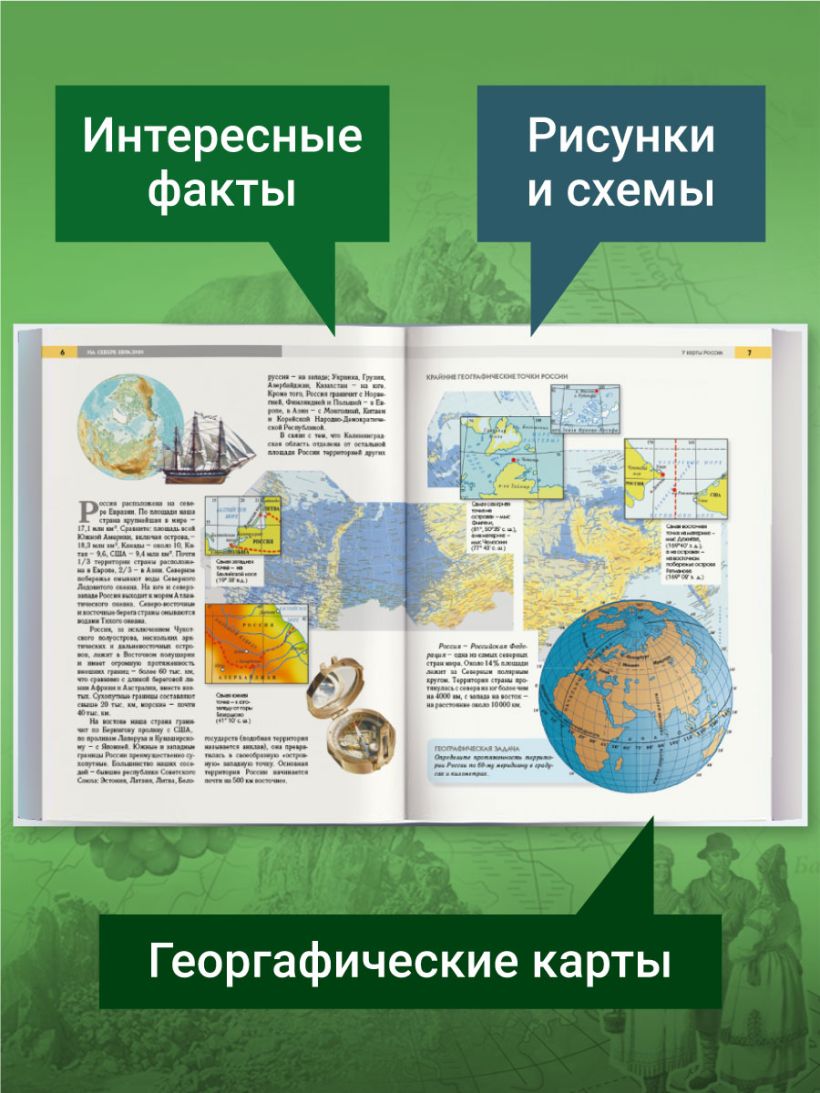 Захватывающее путешествие двух героев по самым интересным местам нашей необъятной родины! Вместе с ними дети узнают, чем славятся города Золотого кольца, где в России находятся пряничный рай и танцующий лес, почему Урал — это драгоценная шкатулка России, а Алтай — самое заповедное место, и что скрывается за загадочными названиями Карелия, Камчатка и Чукотка. Также вы посетите самую высокую в России гору Эльбрус, самое холодное место и самое глубокое на планете озеро Байкал. Книга включает в себя увлекательные задания и игры, а также оригинальные иллюстрации, созданные специально для издания. Издание полностью обновлено и дополнено, подготовлено с учетом всех санитарно-технических требований и абсолютно безопасно для детей.