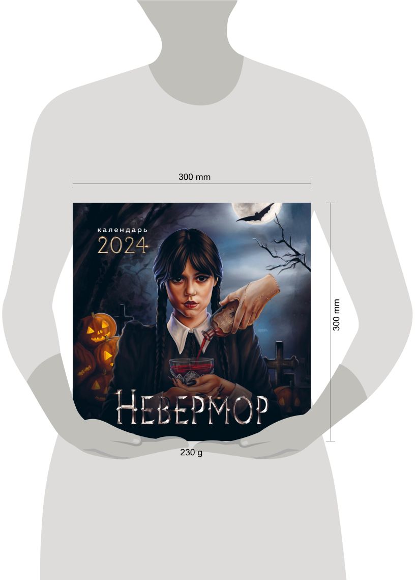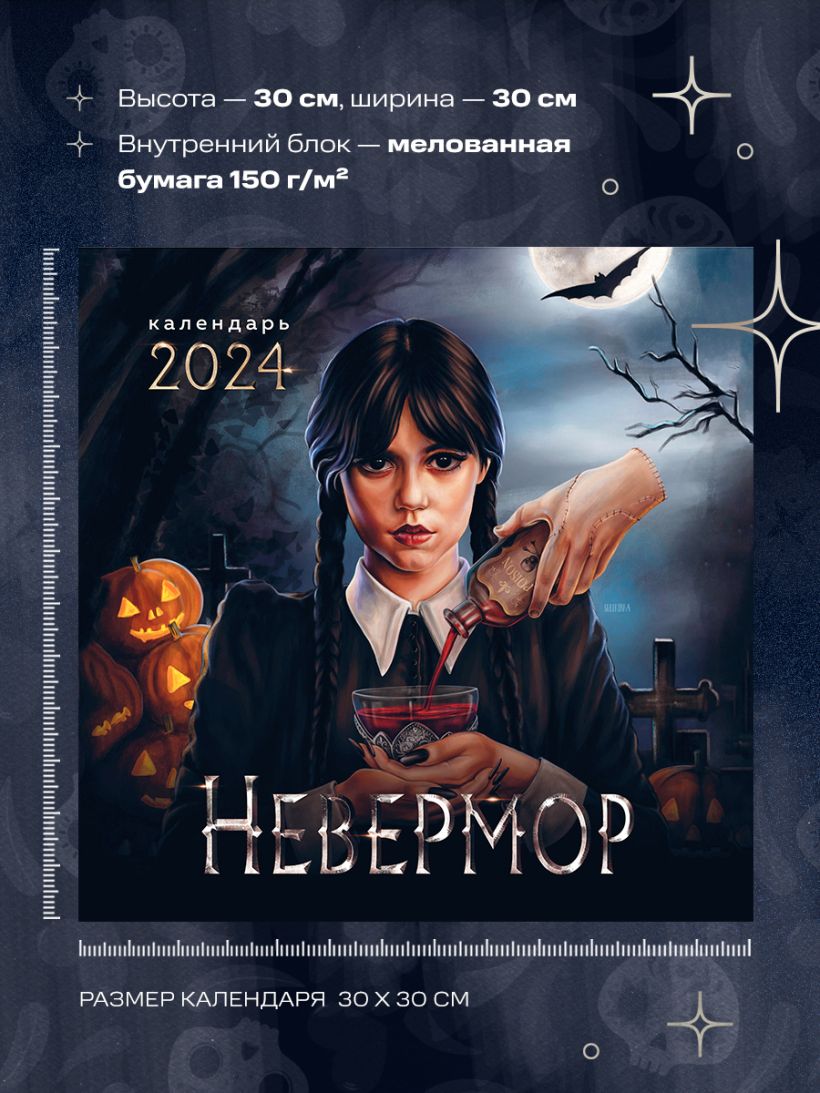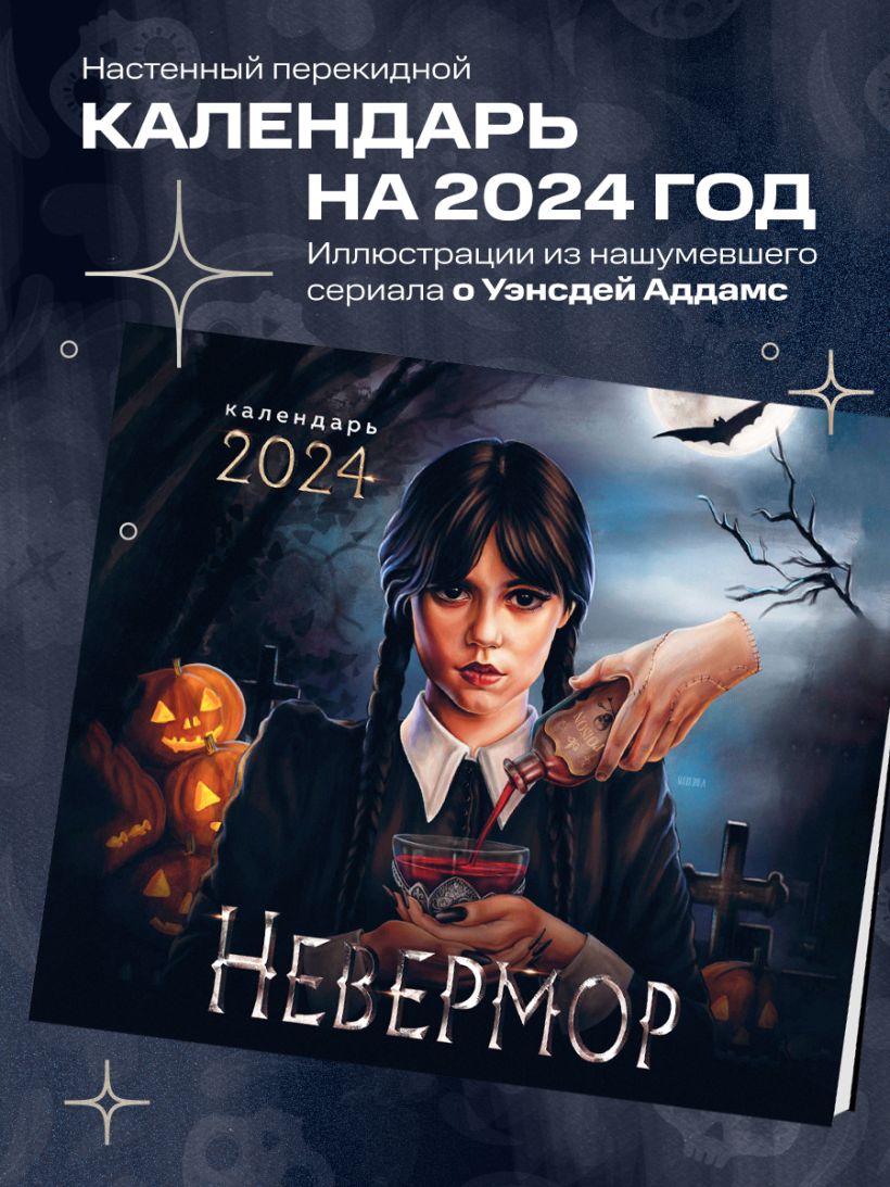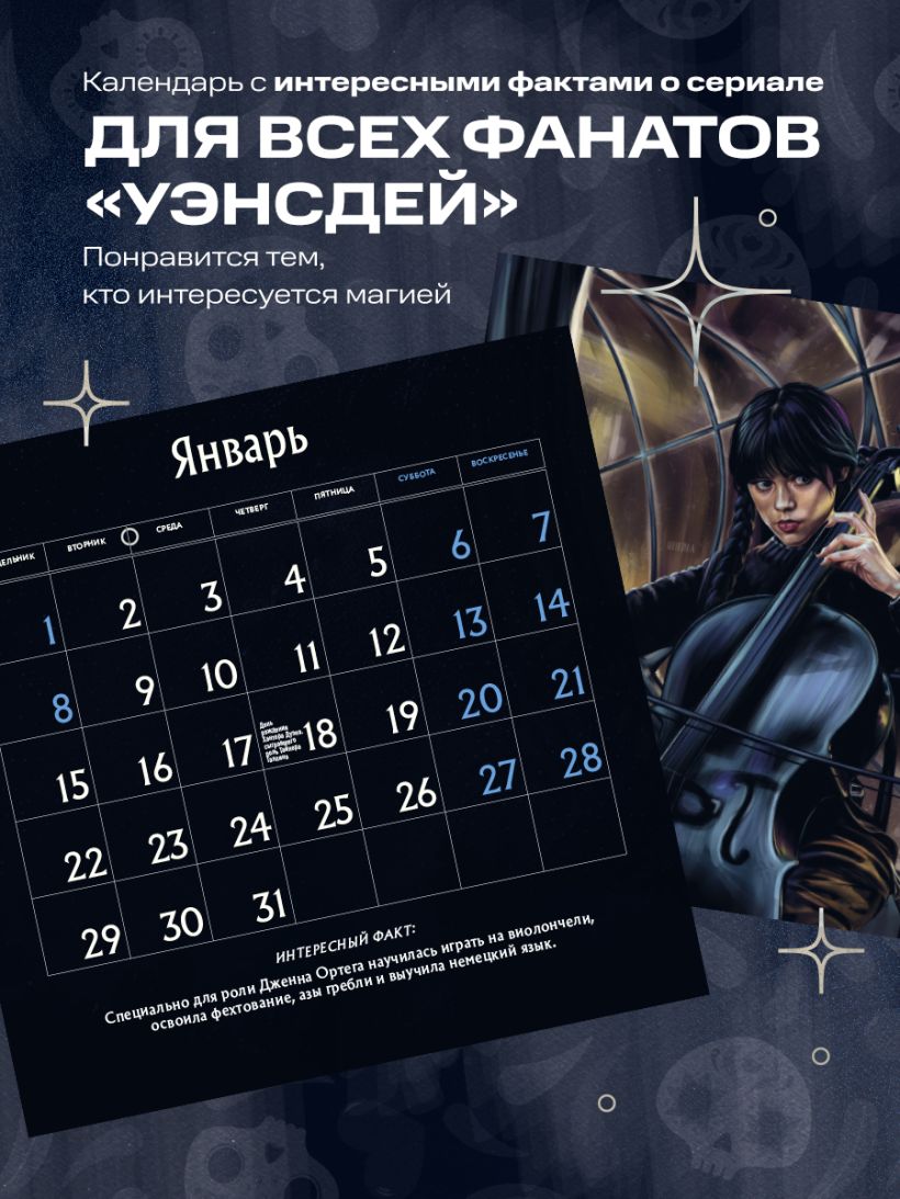 Календарь с иллюстрациями из нашумевшего сериала «Уэнсдей». Уникальные иллюстрации и интересные факты о сериале, солцнестояния и другие леденящие кровь события отмечены в календаре.