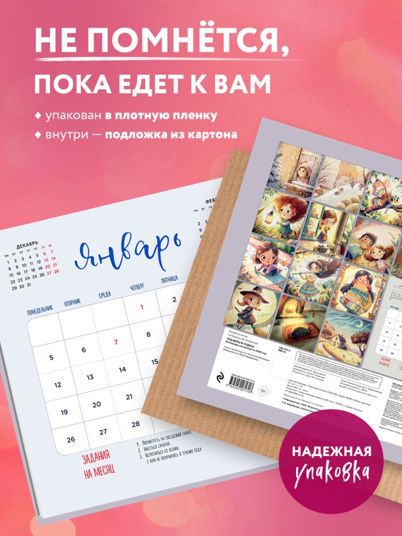 Календарь Татьяны Мужицкой с яркими иллюстрациями от Влады Коваль! В сетке — вдохновляющие цитаты автора и необычные праздники вроде «Всемирного дня “Спасибо”» и «Международного дня заботы о себе». Каждый месяц — как напоминание: жить можно с радостью, легкостью и любовью к себе. Совокупный тираж книг Татьяны Мужицкой — 360 000 экземпляров. Наши настенные календари отличаются высоким качеством исполнения! Тщательно подобранные иллюстрации, напечатанные на глянцевой бумаге высочайшего качества, станут настоящим украшением дома, а в календарной сетке найдется место для ваших планов: большие клетки позволят делать записи и организовать свой год! В серии настенных календарей издательства «ЭКСМО» каждый найдет тему по вкусу: великие художники, великолепные подборки с самыми знаменитыми произведениями искусства, легендарные кинематографические саги и игры, главные книжные авторы и бестселлеры, фотографии и иллюстрации любимых животных и многое-многое другое! Технические параметры: - Тип календаря — настенный перекидной. - Год — 2026. - Календарная сетка — с разбивкой по месяцам. - Вид скрепления — скрепка. - Ширина — 30 см. - Высота — 30 см. - Внутренний блок — мелованная бумага 150 г/м2. - Подложка — плотный гофрокартон для поддержания формы. - Индивидуальная упаковка в плотный целлофановый пакет.