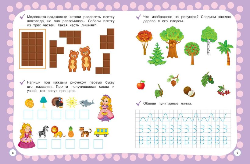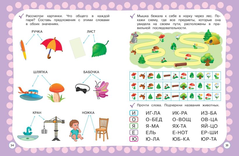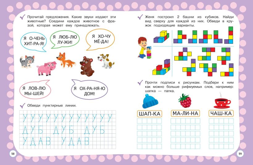 Выполняя доступные игровые задания вместе с взрослым и тратя на это минимальное количество времени, ребенок потренирует навык слогового чтения; познакомится с составом числа и сможет решить примеры на сложение и вычитание; будет обводить по пунктиру цифры, буквы, слова, узоры, проходить лабиринты; разовьёт внимание, память, речь, мышление, графические навыки.