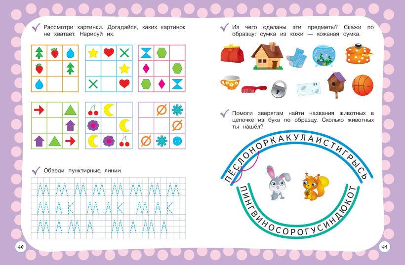 Выполняя доступные игровые задания вместе с взрослым и тратя на это минимальное количество времени, ребенок потренирует навык слогового чтения; познакомится с составом числа и сможет решить примеры на сложение и вычитание; будет обводить по пунктиру цифры, буквы, слова, узоры, проходить лабиринты; разовьёт внимание, память, речь, мышление, графические навыки. Яркие красочные иллюстрации принесут ребенку позитивные эмоции и возможность воспринимать обучение как игру. Занимаясь, он не только интересно и с пользой проведет время, но и получит необходимый для его возраста объем знаний, умений и навыков.