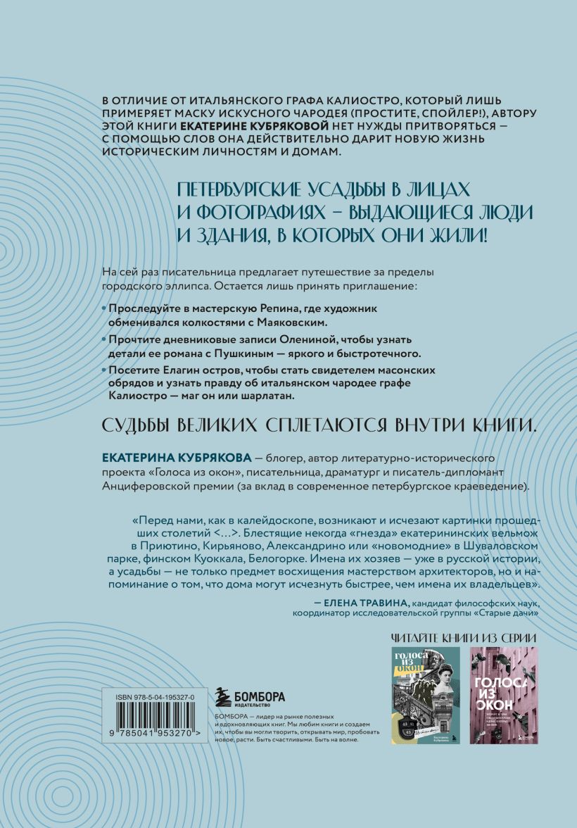 Автор серии "Голоса из окон" вновь подсвечивает жизнь петербургской элиты прошлых столетий – на этот раз за пределами городского эллипса. Возьмите свечу и проследуйте в мастерскую усадьбы Пенаты, где два художника, Маяковский и Репин, обменивались колкостями. Прочтите дневниковые записи Олениной, чтобы узнать детали ее романа с Пушкиным – яркого и скоротечного. Посетите Елагин остров, чтобы стать свидетелем масонских обрядов и узнать правду о графе Калиостро, адепте итальянского чародейства, – маг он или шарлатан?