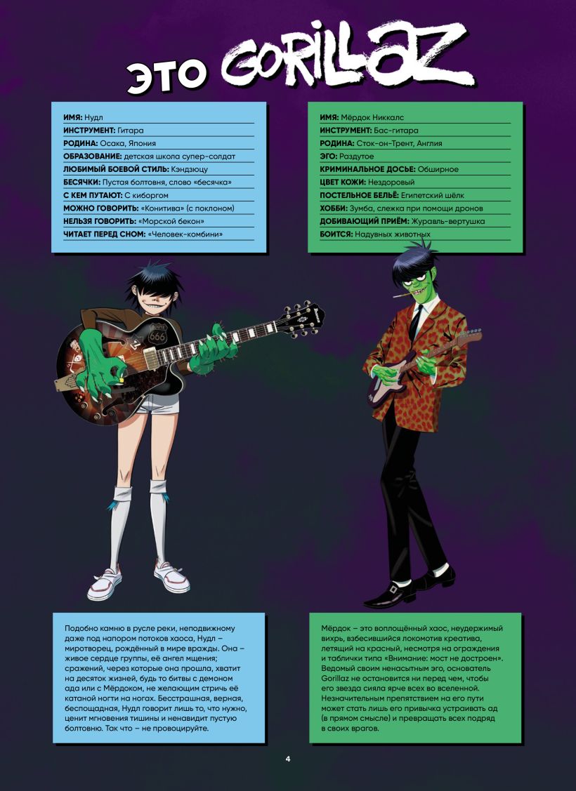 Знали ли вы, что Мёрдок, основатель группы и непревзойдённый бас-гитарист, в своё время написал мемуары? В этой книге вас ждёт сочный отрывок из этого гримуара! Расс, как истинный киноман, расскажет о своих любимых фильмах! Нудл во всех подробностях промурлычет о музыке, помогающей ей устраивать бойню (музыкальную, конечно), а 2D проведёт мастер-класс по… штанам?! Да уж, от этого квартета всего можно ожидать!