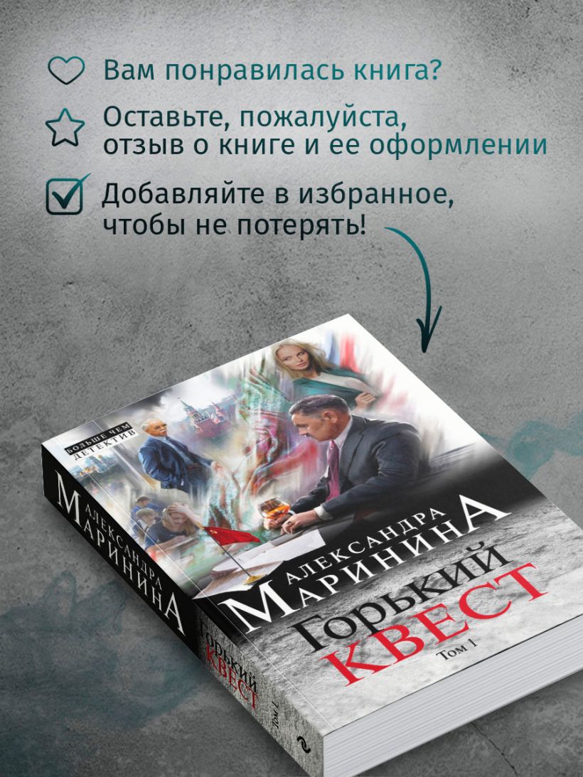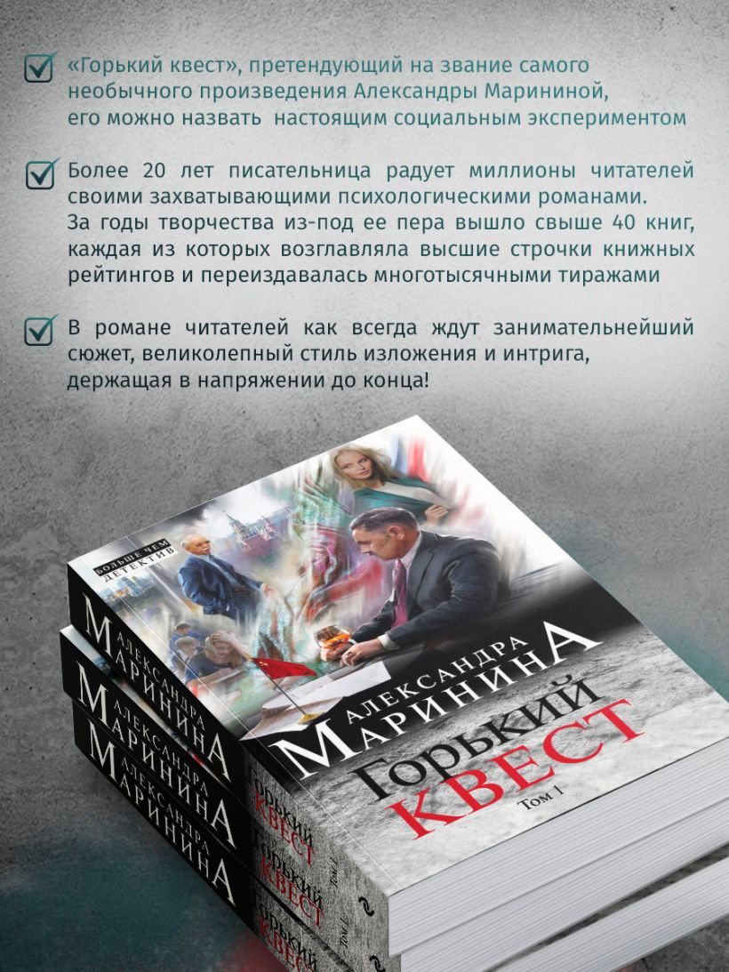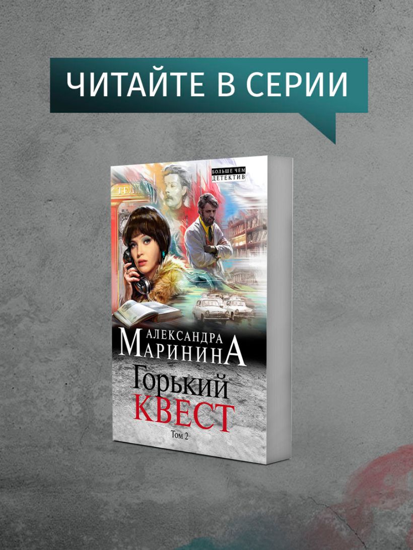 «Горький квест» — это невероятный эксперимент по погружению современных молодых людей в советскую эпоху 70-х годов. Для написания этого произведения Александра Маринина организовала фокус-группы современной молодежи и их реальные реакции описала в книге.