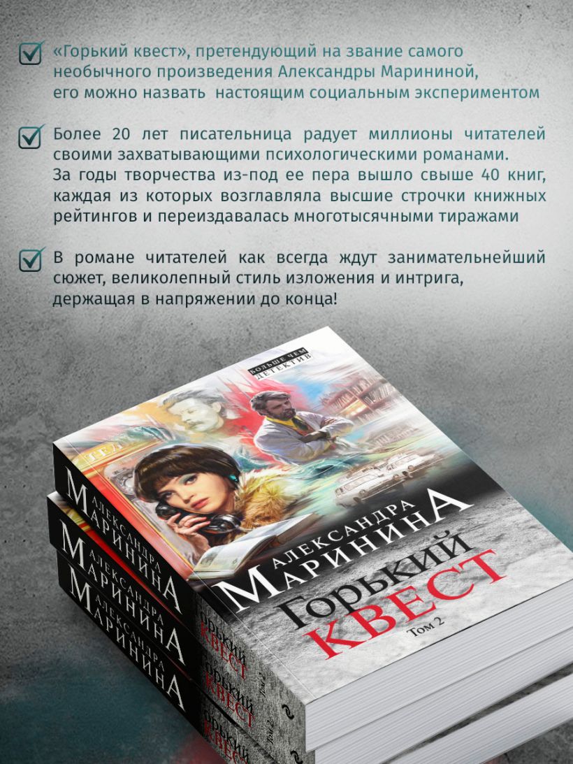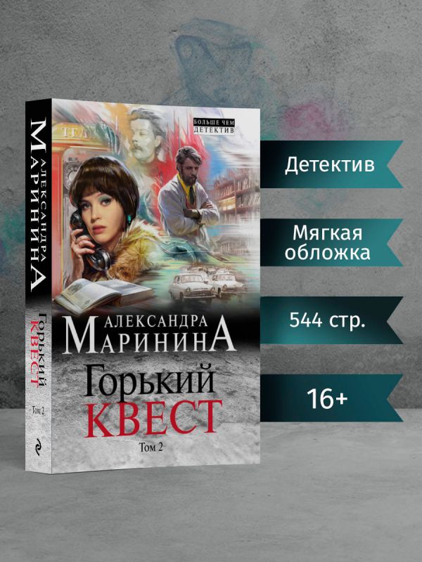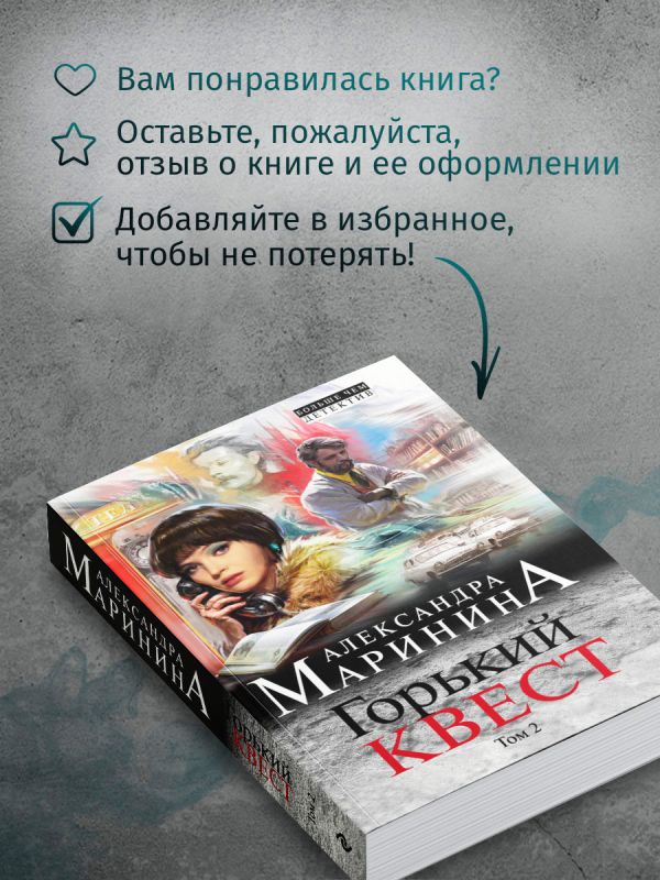 «Горький квест» — это невероятный эксперимент по погружению современных молодых людей в советскую эпоху 70-х годов. Для написания этого произведения Александра Маринина организовала фокус-группы современной молодежи и их реальные реакции описала в книге.