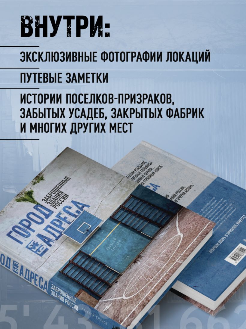 На страницах книги вас ждут невероятные фотографии каких-то локаций, которые пугают и завораживают одновременно. Автор книги, фотограф и автор популярного блога Алексей Грачев (alexdoomer) поделится путевыми заметками и расскажет забытую историю поселков-призраков и закрытых фабрик.