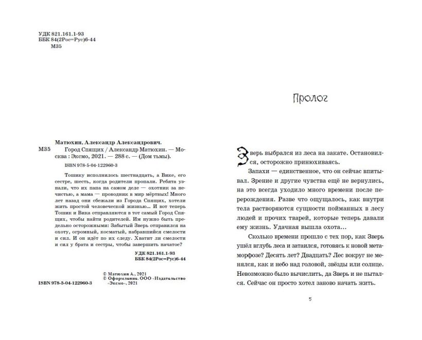 Они были обычной семьёй. Папа иногда уезжал в дальние поездки, говорил, что по делам, а мама была известной писательницей. Тошику исполнилось шестнадцать, а Вике, его сестре, шесть, когда родители пропали. Ребята узнали, что их папа на самом деле — охотник за нечистью, а мама — проводник в мир мёртвых! Много лет назад они сбежали из Города Спящих, хотели жить простой человеческой жизнью… И вот теперь Тошик и Вика отправляются в тот самый Город Спящих, чтобы найти родителей. Им нужно быть предельно осторожными: Забытый Зверь отправился на охоту, огромный, косматый, набравшийся смелости и сил. И он идёт по их следу. Хватит ли смелости и сил у брата и сестры, чтобы завершить начатое?
