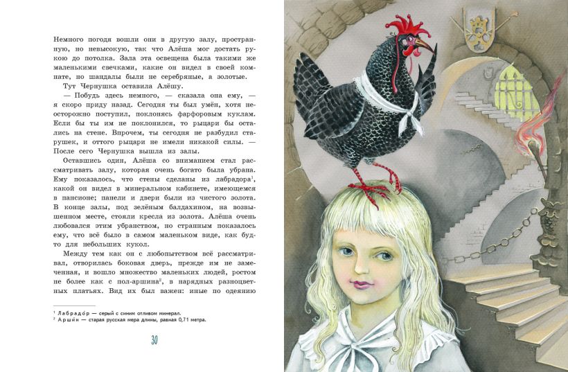 Твёрдый глянцевый переплёт. Плотная белая бумага, чёткий, хорошо читаемый шрифт и стильное оформление каждой сказки.