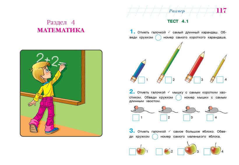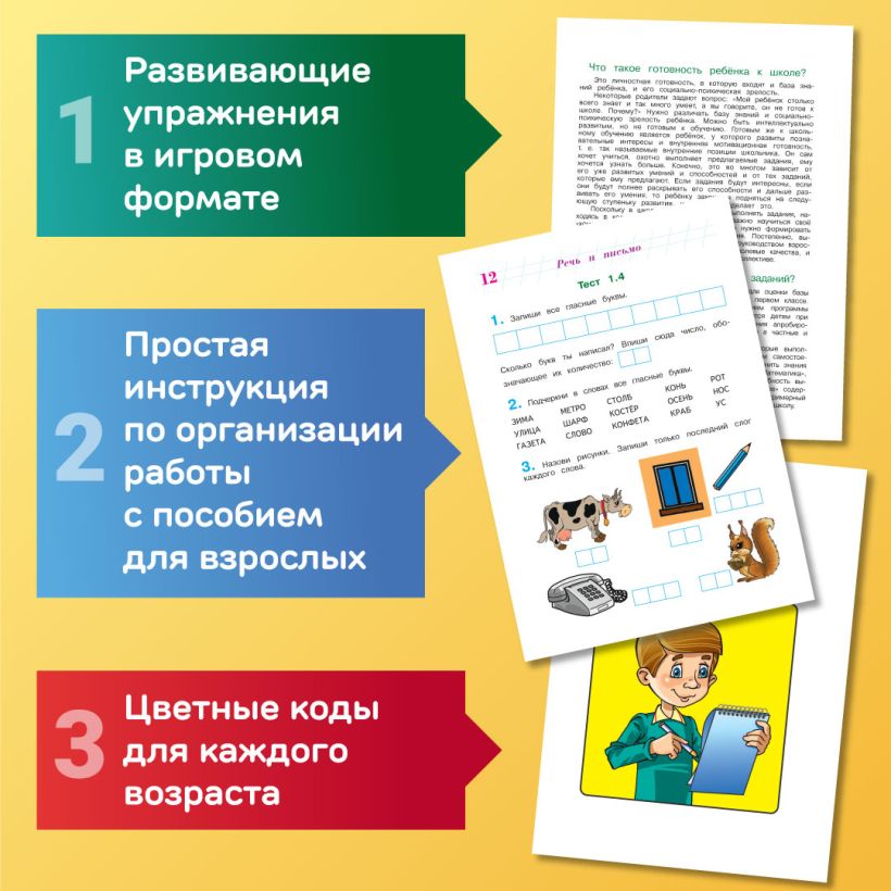 Легендарная серия обучающих пособий для развития ребенка и подготовки к школе теперь в новом оформлении! Пособие включает в себя тесты для определения уровня знаний ребенка по четырем разделам: «Математика», «Развитие речи», «Пространство», «Осведомленность». Блок «Готовность к школе» содержит задания из всех разделов и представляет собой примерный тест, который предлагается детям при поступлении в школу. Кроме того, в пособии есть таблица определения уровня знаний и ответы к некоторым заданиям.