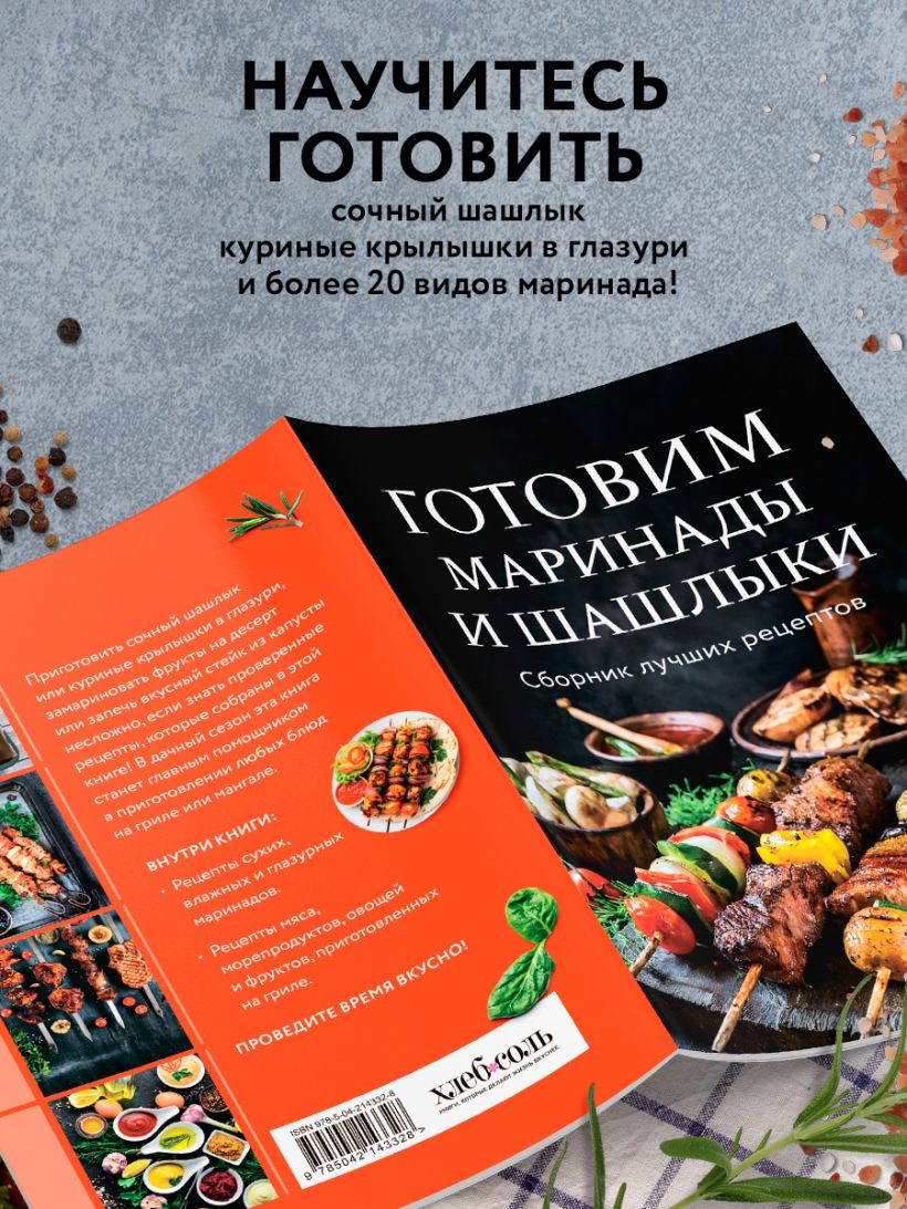 В дачный сезон эта книга станет главным помощником в приготовлении любых блюд на гриле или мангале. Внутри собрано более 20 рецептов сухих, влажных и глазурных маринадов и 10 рецептов мяса, морепродуктов, овощей и фруктов, приготовленных на гриле. Проведите время вкусно!