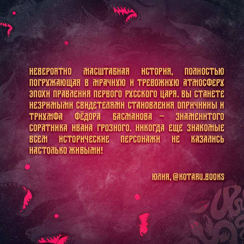 Обложку для книги нарисовала известная художница Кориандр, которая суммарно имеет около миллиона подписчиков на всех онлайн-площадках. Ее стиль, вдохновленный эстетикой русских сказок, точно передает атмосферу темного русского Средневековья.