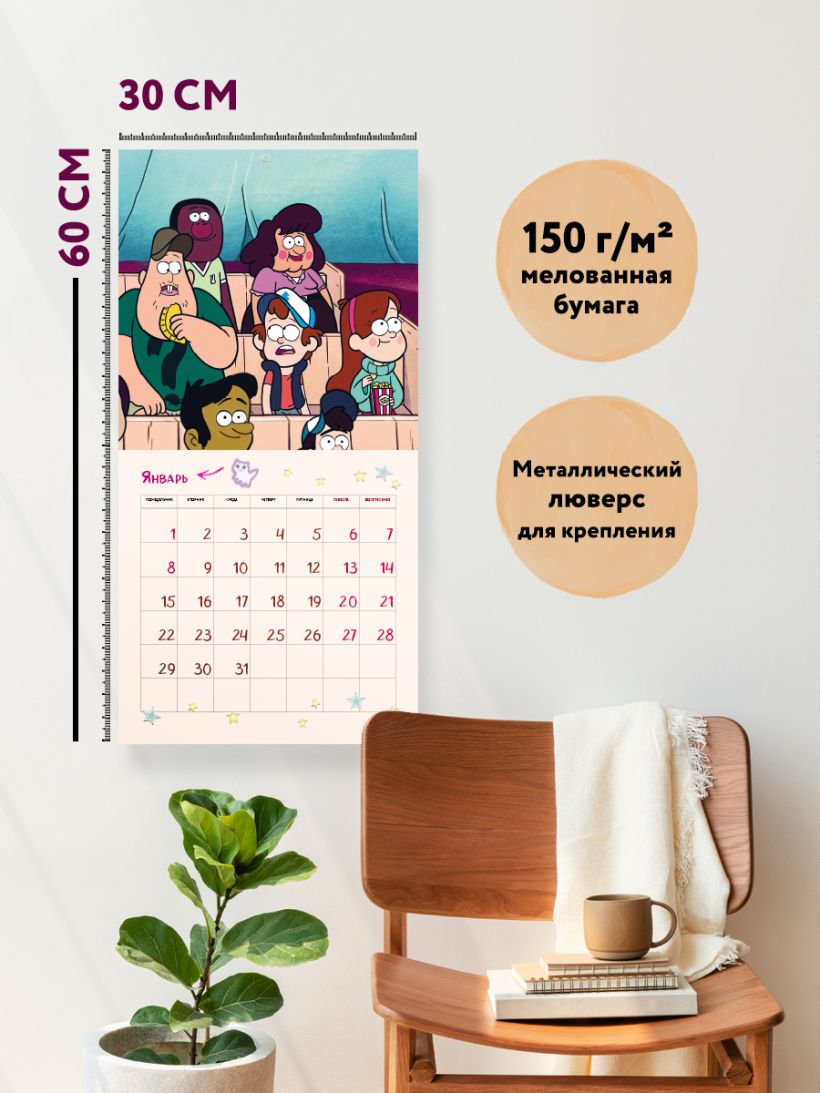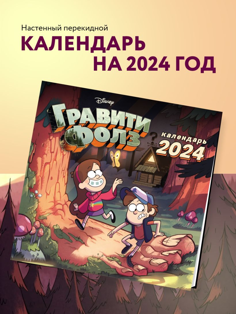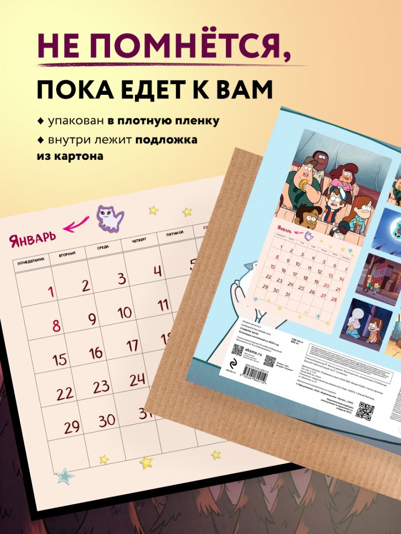 Проведи весь год с героями «Гравити Фолз»! Удобный настенный календарь с Диппером, Мейбл, Пухлей, Стенли и другими станет отличным приобретением себе и суперподарком близким. Внутри тебя ждут уникальные сочные иллюстрации, доступные только по лицензии, крутая сетка с основными праздниками и местом для записи важных событий. А удобный формат 300х300 мм позволит повесить его абсолютно везде. Подари себе кусочек хорошего настроения на весь год!
