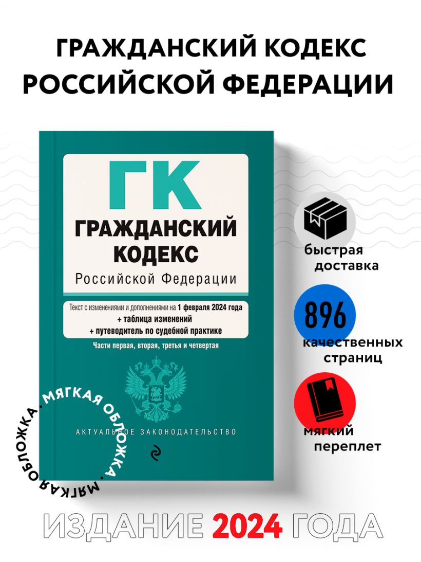 Настоящее издание содержит текст Гражданского кодекса Российской Федерации с изменениями и дополнениями на 1 февраля 2024 года с удобной навигацией, таблицей изменений и путеводителем по судебной практике. Если есть изменения, вступающие в силу позднее, то вместе с редакцией нормы, действующей на эту дату, приводится норма в новой редакции и указывается дата, с которой она вступает в силу.