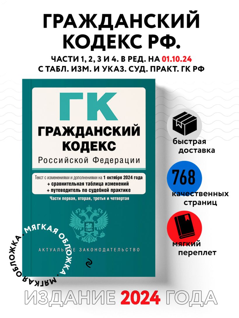 Настоящее издание содержит текст Гражданского кодекса Российской Федерации с изменениями и дополнениями на 1 октября 2024 года с удобной навигацией, таблицей изменений и путеводителем по судебной практике. Если есть изменения, вступающие в силу позднее, то вместе с редакцией нормы, действующей на эту дату, приводится норма в новой редакции и указывается дата, с которой она вступает в силу.