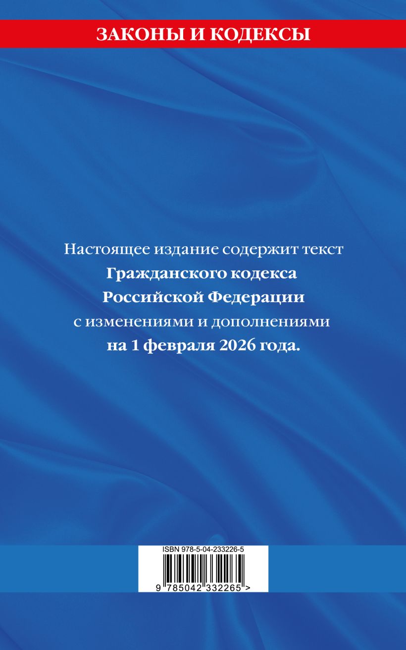 Настоящее издание содержит текст Гражданского кодекса Российской Федерации (первая, вторая, третья и четвертая части) в редакции, действующей на 1 февраля 2026 года.