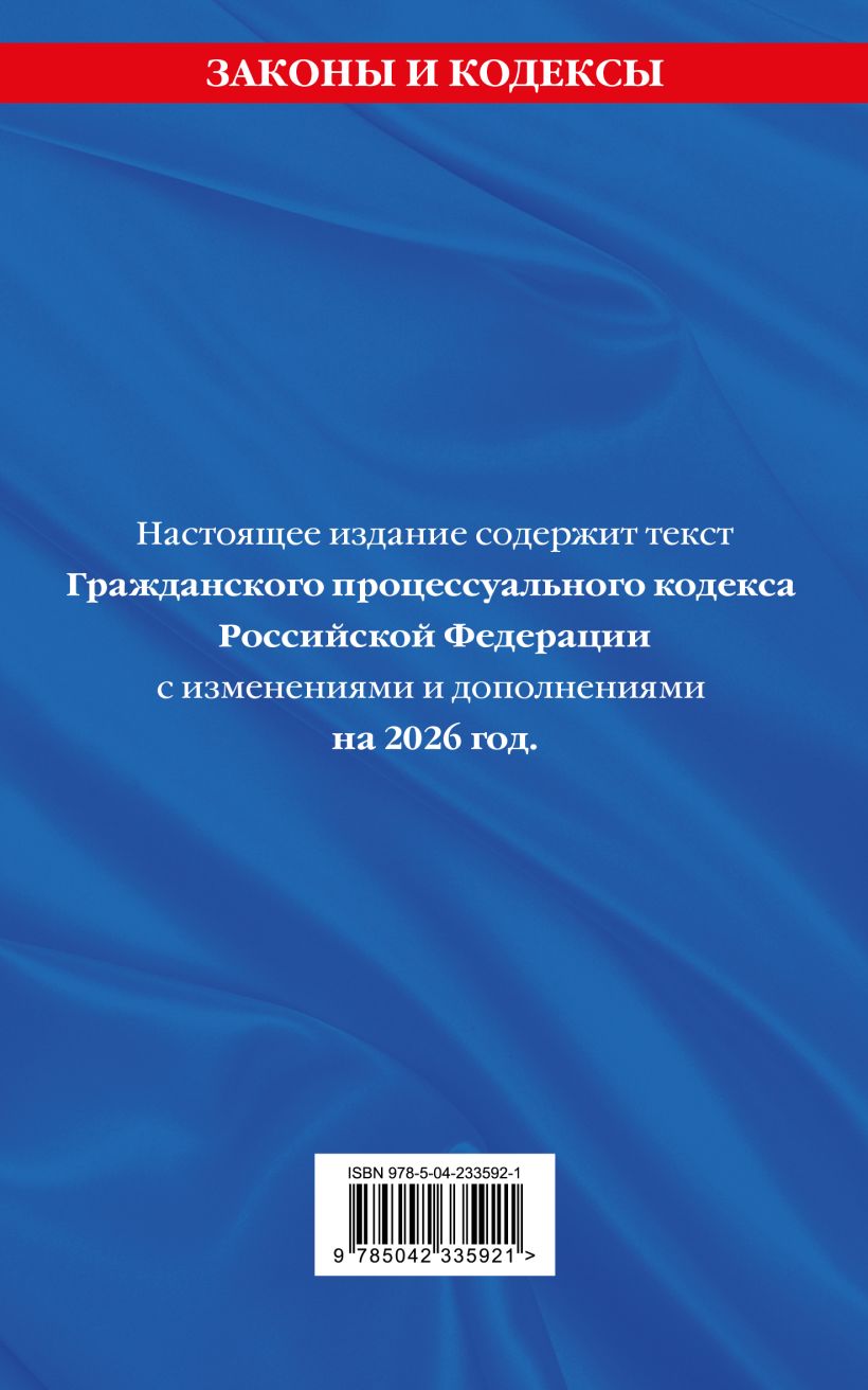 Настоящее издание содержит текст Гражданского процессуального кодекса Российской Федерации с изменениями и дополнениями на 2026 год с удобной навигацией и таблицей изменений. Если есть изменения, вступающие в силу позднее, то вместе с редакцией нормы, действующей на эту дату, приводится норма в новой редакции и указывается дата, с которой она вступает в силу.