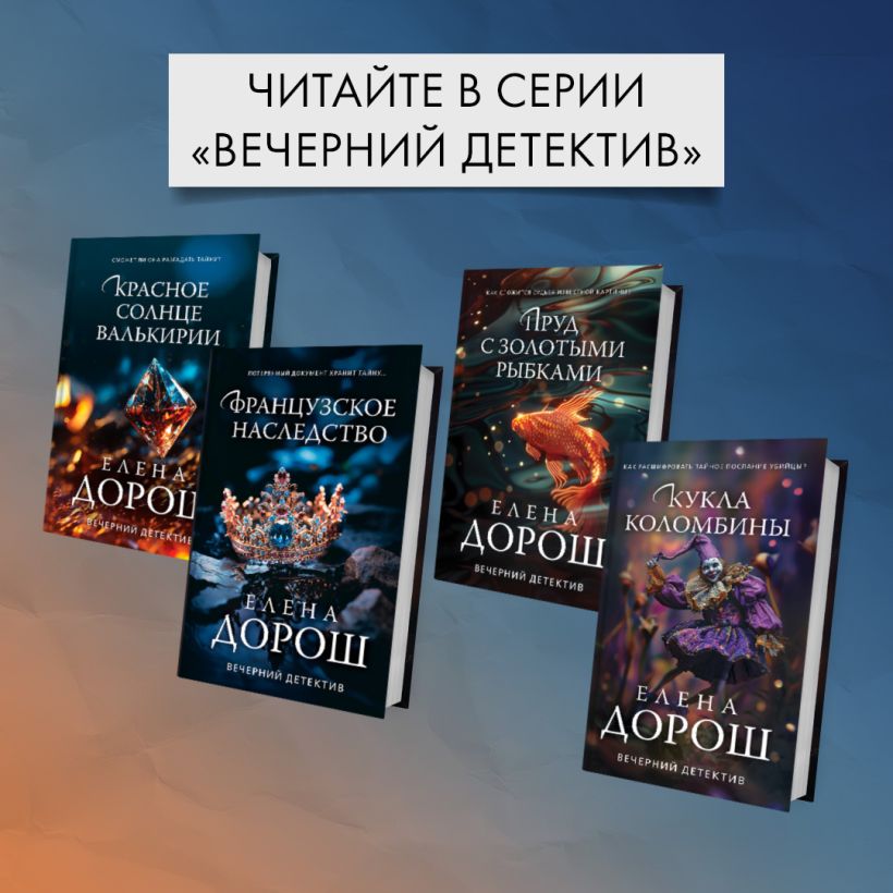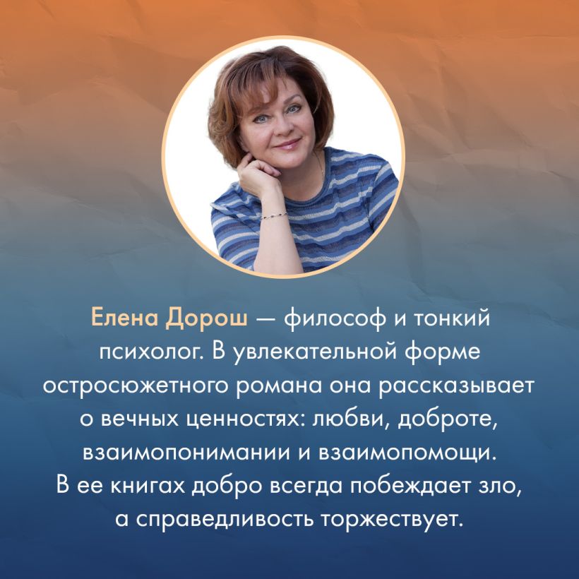 Елена Дорош пишет для тех, кто не впадает в уныние, не боится испытаний и ждет от жизни только хорошее. Ее книги — не просто детективы. Они не только о любви. Каждая открывает увлекательную, порой малоизвестную сторону человеческого бытия.