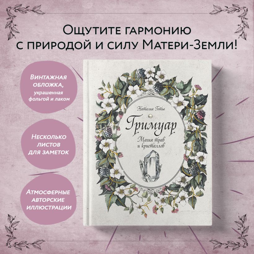 Обложка приятная на ощупь, выполнена в мягких и теплых тонах. Автор наполнила книгу волшебной и положительной энергетикой! В книге собранно описание большого колличества трав и кристаллов, к которым нарисованы рисунки с их изображением, очень тонкая работа. Хоть они и представлены в книге в черно-белых тоннах, каким-то магическим волшебством рисунки передают тепло и свойство трав и камней благодаря тонко переданной игре свето-тени даже через все этаппы изготовления книги.