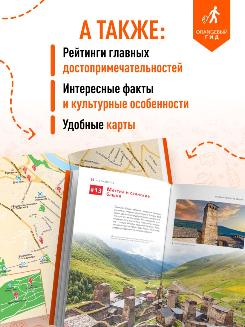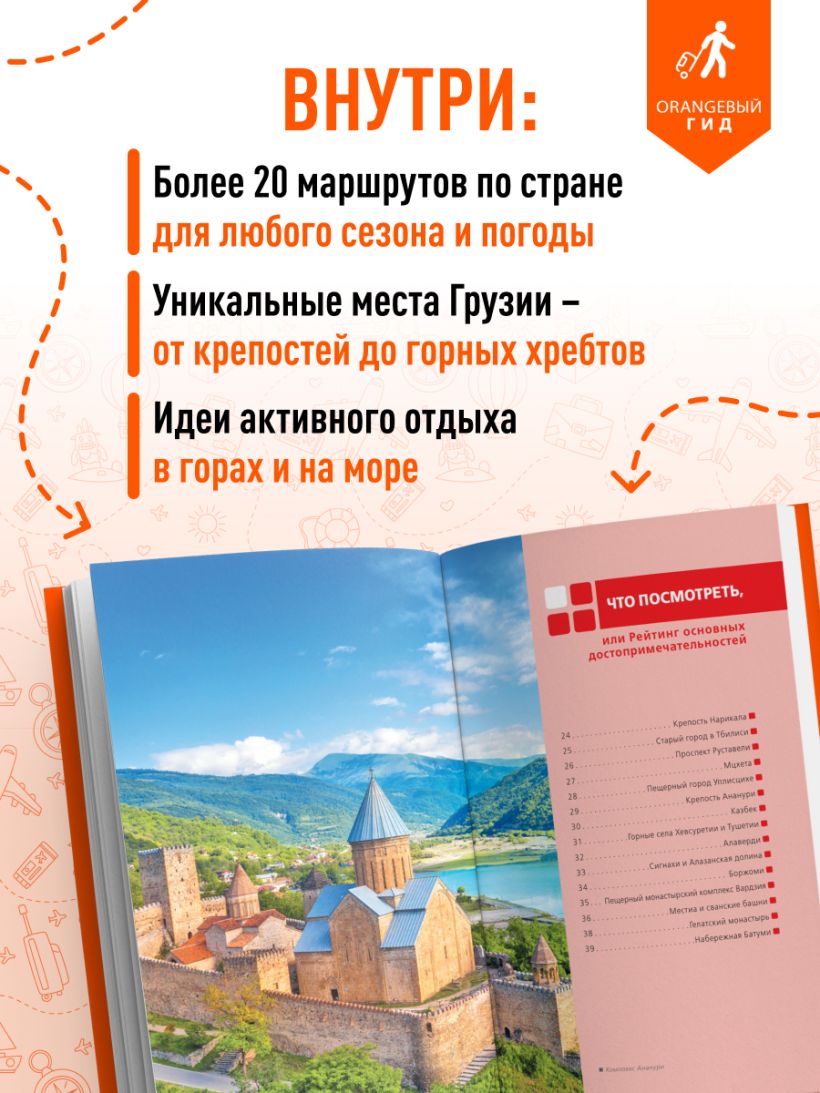 В нем содержится актуальная и полезная информация о главных городах страны, различные маршруты на любой вкус, подсказки, что делать, если идет дождь, или где искать лучшие смотровые площадки, а также множество полезных авторских советов. Посетите пещерный город Уплисцихе, песочные пляжи Батуми, город-курорт Боржоми, загадочные горные крепости — выбор только за вами!