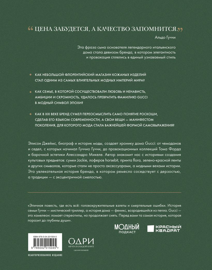 Алисон Джеймс, биограф и историк моды, рисует увлекательную хронику дома Gucci: от чемоданов и седел, с которых начинал Гуччио Гуччи, до провокационных открытий Тома Форда и барочной эстетики Алессандро Микеле. Это история бренда, в котором ремесло соседствует с дерзостью, а традиция — с эксцентричной смелостью.