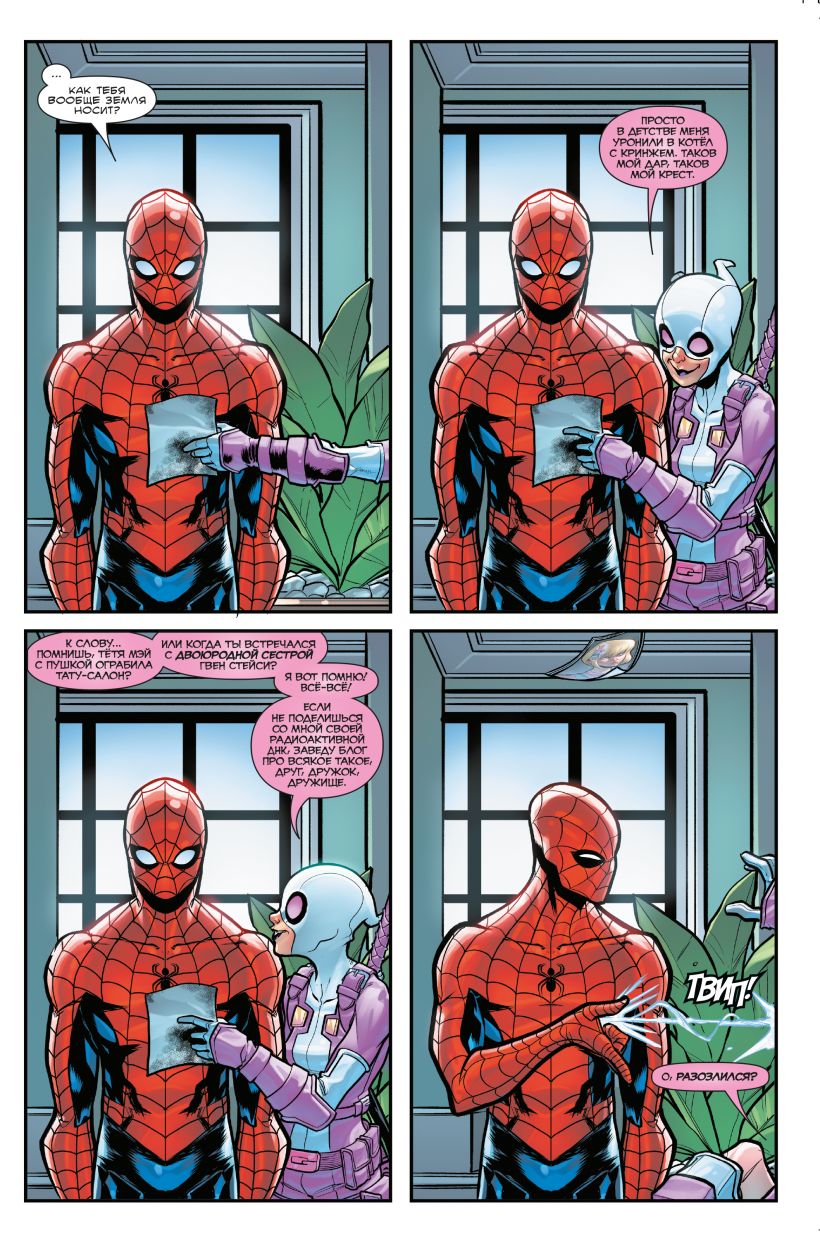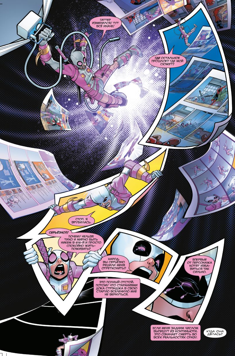 Гвен Пулл каким-то образом проникла во Вселенную Marvel и навела там шороху! Теперь ей угрожает забвение, и поэтому она всеми силами старается наследить в 616-й так, чтобы остаться в ней навсегда! Для начала Гвен раскроет тайну личности Человека-паука! Потом устроит налёт на жилище Фантастической Четвёрки! Ну а затем одолеет Бессмертного Халка, подняв молот Тора Мьёльнир! Но чем сильнее она будет буянить, тем больше мы узнаем о её происхождении — да и она сама тоже! Неужели мы имеем дело с самым мощным ретконом в истории персонажа? В любом случае Гвен либо станет суперзвездой, либо вернётся домой! Пристегните ремни и приготовьтесь: вас ждёт лучший в истории сиквел, в подзаголовке которого есть фраза «Наносит ответный удар»!