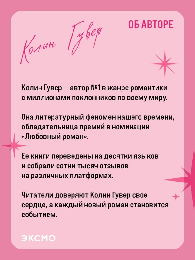 Колин Гувер — автор, которому читатели доверяют свое сердце. Она — мировой тренд, литературный феномен нашего времени, троекратная обладательница премии Goodreads Choice Award в номинации «Любовный роман». Ее произведения переведены на десятки языков. Продажи книг Колин Гувер превысили продажи Стивена Кинга и Джорджа Мартина.