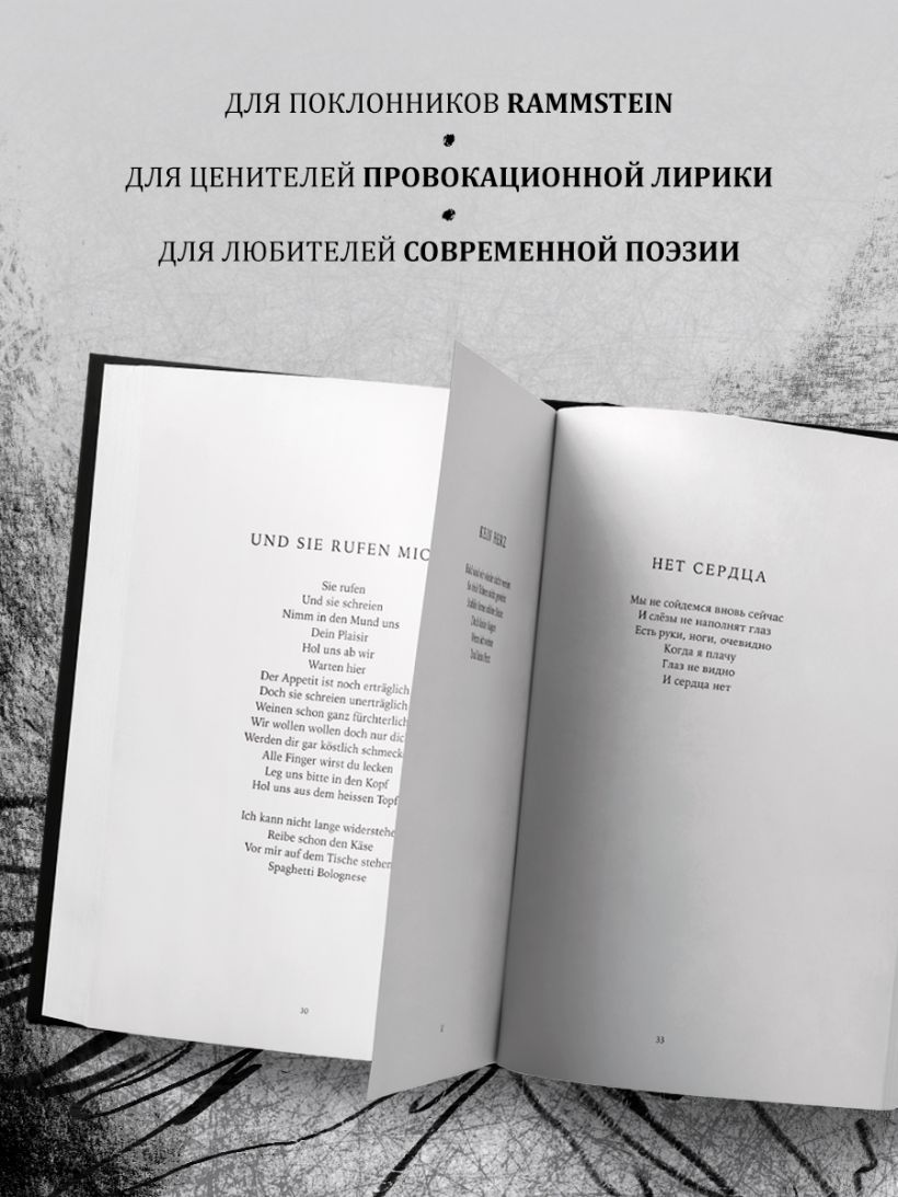 Тилль Линдеманн — вокалист группы Rammstein, большой провокатор и жесткий лирик. Во время концертов он получил десятки ожогов от пиротехники и даже вставил в щеку провод, чтобы при пении во рту горел свет. Чтобы сделать стихи предельно откровенными и шокирующими, он проделывает похожие «смертельные» трюки на бумаге. Он не стесняется болезненных тем: смерть как вальс для мертвецов, любовь как блуд у алтаря, красота как цветок, увядающий за считанные мгновения. Эта смелая поэзия может шокировать неподготовленного читателя. Ограничение по возрасту — 18+.