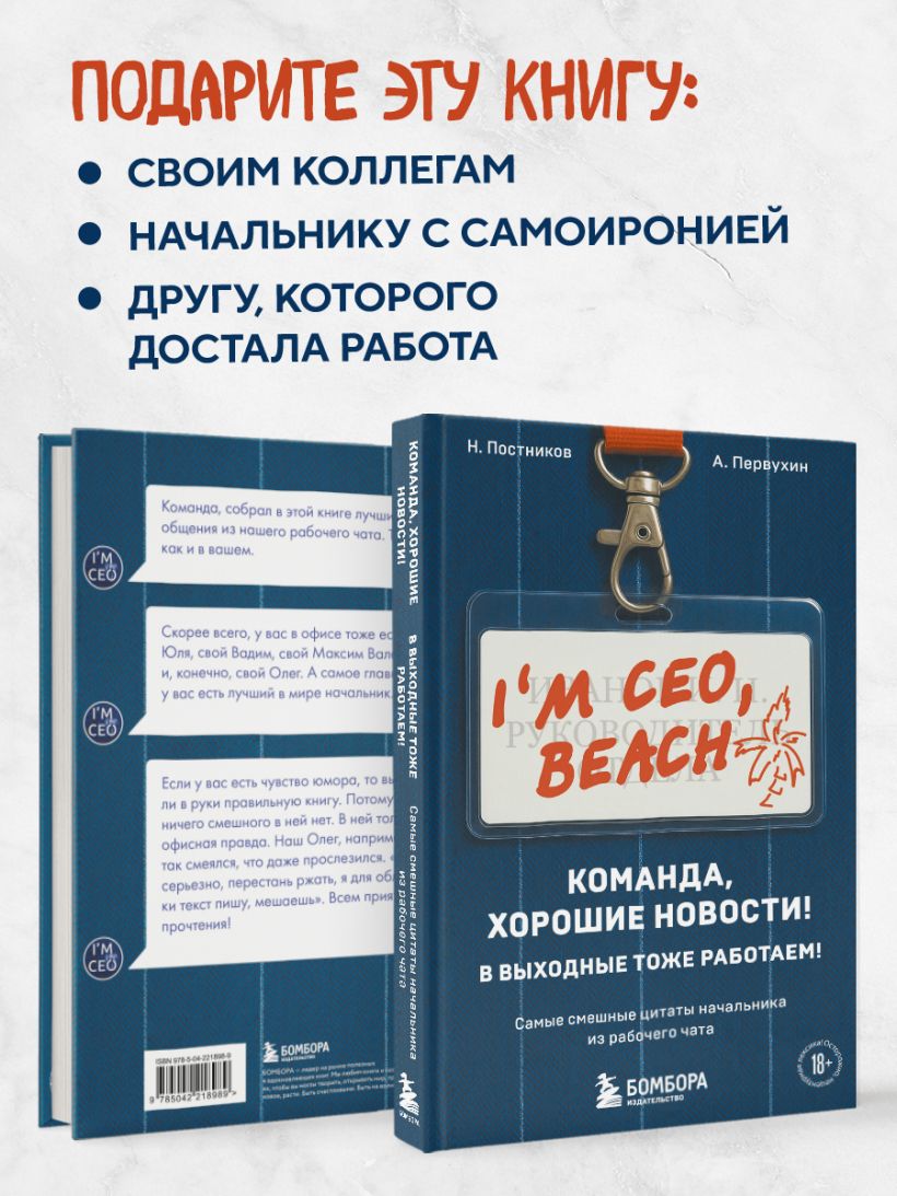 От создателей Telegram-канала "I'm CEO, beach" с аудиторией 70 тыс. подписчиков, который документирует шедевры корпоративного абсурда. Теперь самые сочные, бесячие и до боли знакомые перлы собраны в одной книге — как терапевтическое пособие по выживанию в офисе.