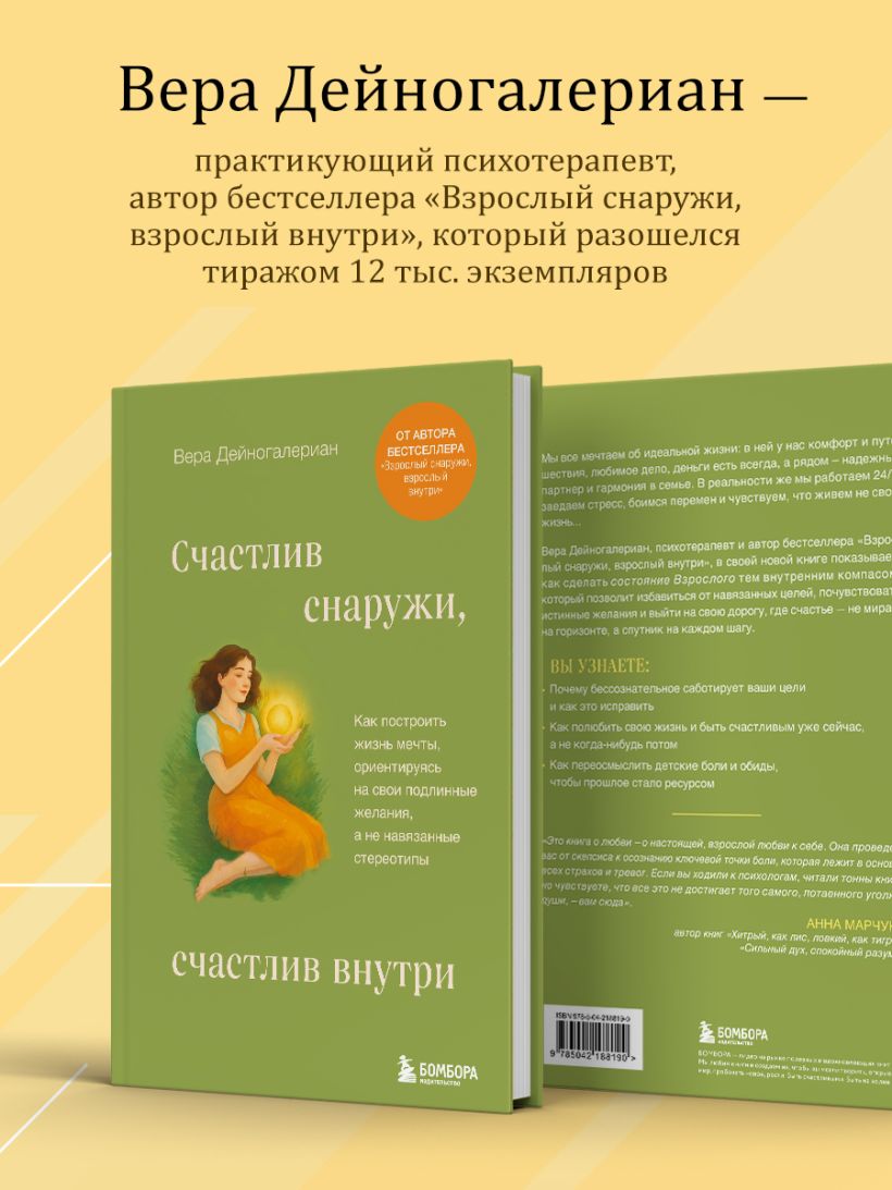 Вера Дейногалериан, психотерапевт и автор бестселлера «Взрослый снаружи, взрослый внутри» в своей новой книге показывает, как сделать состояние Взрослого тем внутренним компасом, который позволит избавиться от навязанных целей, почувствовать истинные желания и выйти на свою дорогу, где счастье — не мираж на горизонте, а спутник на каждом шагу.