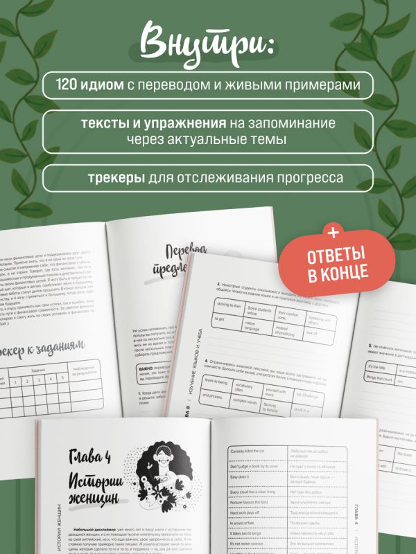 - разбор 120 идиом через увлекательную подачу с примерами и заданиями на основе историй о женщинах;