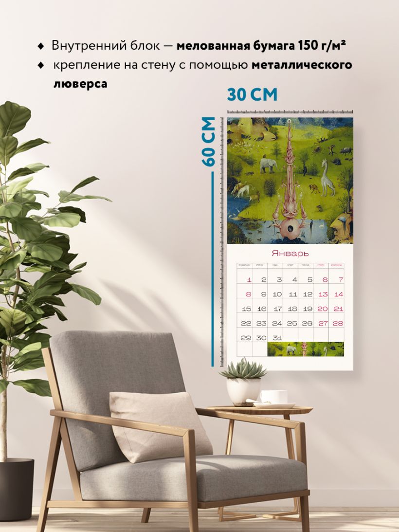 Практичный и эстетичный, этот календарь каждый месяц будет радовать вас изображением нового шедевра. Прекрасные картины органично дополнят любой интерьер и помогут планировать время. В этом календаре представлены шедевры кисти Иеронима Босха.