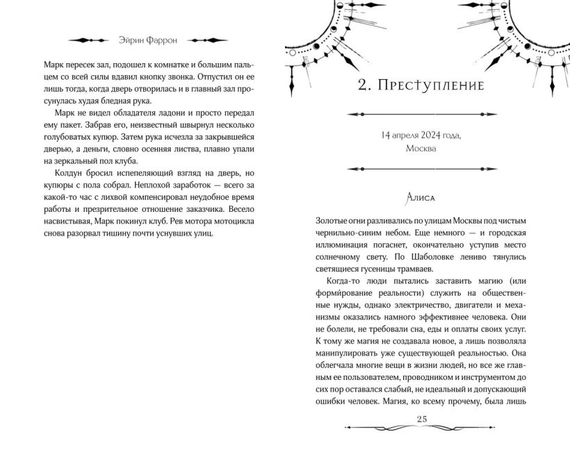 Вторая часть городского славянского фэнтези Эйрин Фаррон, автора полюбившейся трилогии «Туманы Нуарвилля». На улицах Калининграда неспокойно. Кто-то убивает представительницу магического круга, который был создан, чтобы сдерживать аномалию, источник магии, от разрастания. Магические верви делят между собой четыре района — Октябрьский населяют колдуны. Центральный всегда принадлежал упырям. В Ленинградском обитают длаки, а в Московском — нечистые. В Калининграде убивают сильнейшую колдунью, и, чтобы сохранить баланс в городе, Алиса и ее коллега Дан отправляются распутать дело. Никаких следов магии нет, а единственная улика — трансмутированный янтарь, найденный во рту жертвы. Вскоре в качестве консультанта в город приезжает Марк, владеющий даром видеть скрытое. Все больше погружаясь в новое расследование, колдуны понимают — истоки происходящего лежат в далеком прошлом, а преступник намного опаснее, чем казалось вначале. Мирной жизни Калининграда угрожает большая опасность, и у героев все меньше времени, чтобы предотвратить катастрофу. Идеальное сочетание городского фэнтези и детектива на фоне живописного Калининграда. Эйрин Фаррон выросла в Зеленоградске, поэтому она детально с осой любовью описывает знакомые ей места. Внутреннее оформление порадует каждого. Глоссарий, карта магического Калининграда в макете. Иллюстратор обложки: Саша Рейн.