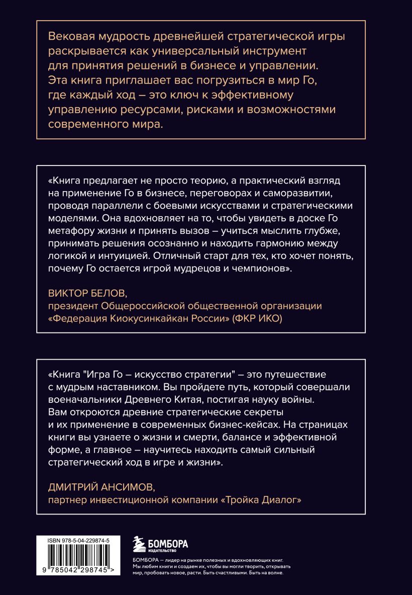 «Книга предлагает не просто теорию, а практическии взгляд на применение Го в бизнесе, переговорах и саморазвитии проводя параллели с боевыми искусствами и стратегическими моделями. Она вдохновляет на то, чтобы увидеть в доске Го метафору жизни и принять вызов - учиться мыслить глубже, принимать решения осознанно и находить гармонию между логикой и интуицией. Отличный старт для тех, кто хочет понять, почему Го остаётся игрой мудрецов и чемпионов».