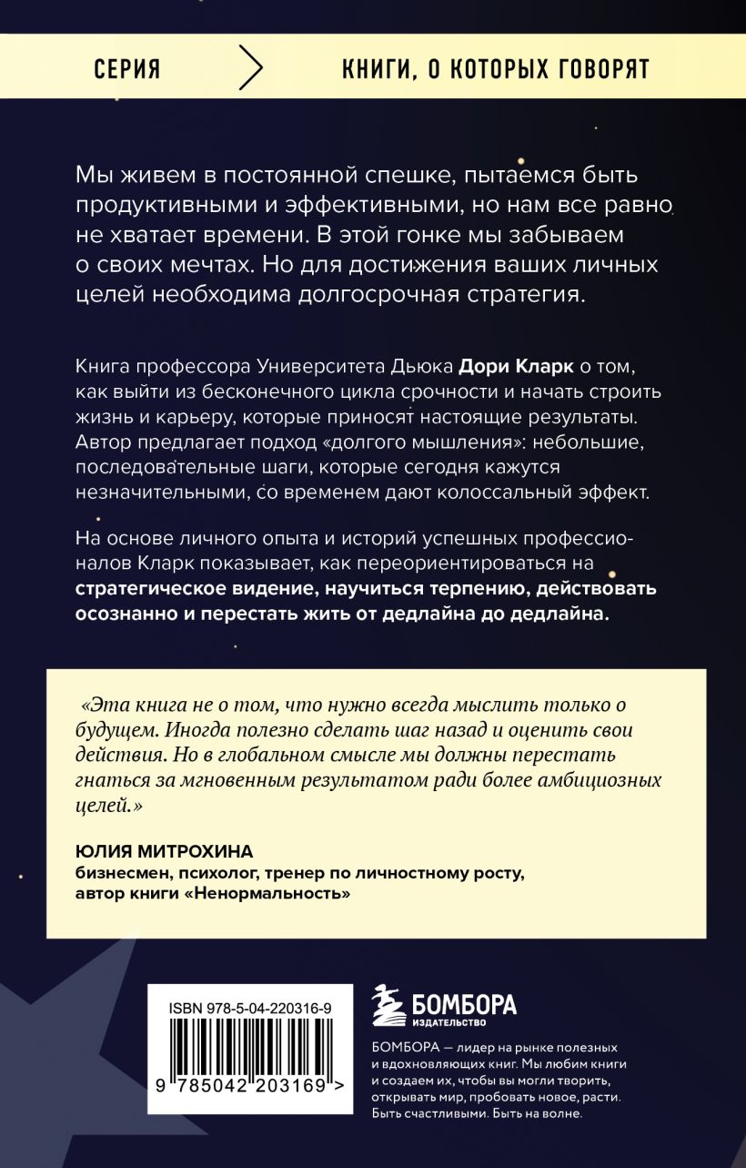 Книга профессора Университета Дьюка Дори Кларк о том, как выйти из бесконечного цикла срочности и начать строить жизнь и карьеру, которые приносят настоящие результаты. Автор предлагает подход «долгого мышления»: небольшие, последовательные шаги, которые сегодня кажутся незначительными, со временем дают колоссальный эффект.