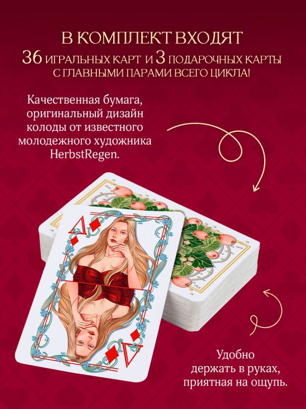 В КОМПЛЕКТ ВХОДЯТ 36 ИГРАЛЬНЫХ КАРТ И 3 ПОДАРОЧНЫХ КАРТЫ С ГЛАВНЫМИ ПАРАМИ ВСЕГО ЦИКЛА!