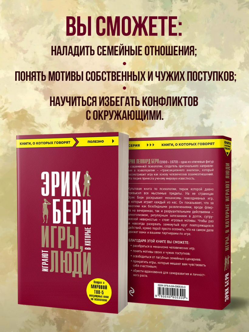 Эрик Леннард Берн (1910—1970) — одна из ключевых фигур в современной психологии, создатель оригинального направления в психотерапии — «транзактного анализа», рассматривающего игру в качестве основы человеческих взаимоотношений. Разработка этой теории принесла ученому мировую известность. 48 лет является абсолютным бестселлером по человеческим взаимоотношениям. Входит в мировой ТОП-5 самых популярных книг по психологии. Прямо сейчас эту книгу читают 739 ЧЕЛОВЕК.