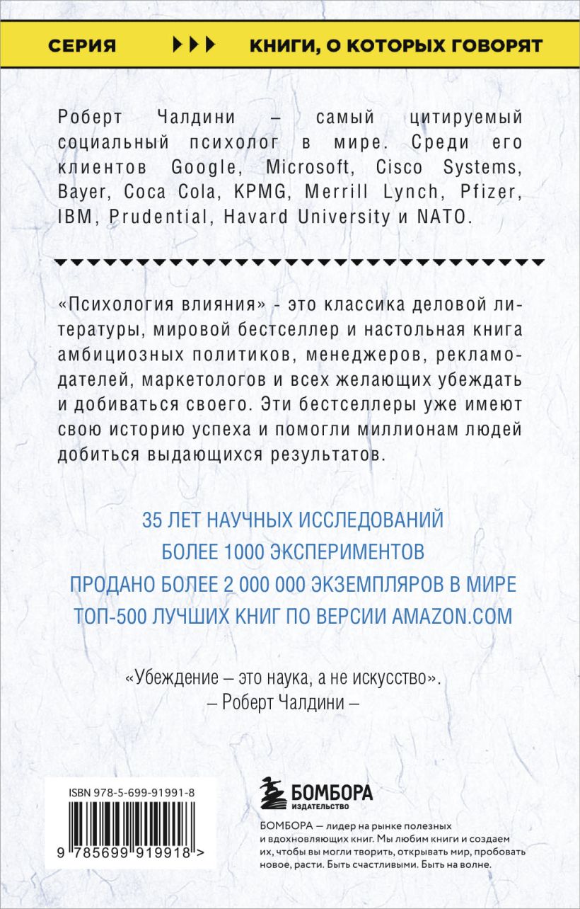 «Психология влияния» — к искусству убеждения можно относиться по-разному. Одни стремятся овладеть им в совершенстве, чтобы всегда и везде добиваться своих целей, другие считают недопустимым, когда используя механизмы воздействия, людям навязывают невыгодные для них условия. Однако никто из нас не хочет стать жертвой манипуляторов, легкой добычей для продавцов, сборщиков средств и рекламодателей. В этой книге Роберт Чалдини, доктор наук, профессор психологии и признанный эксперт в сфере влияния и убеждения, рассматривает шесть универсальных приемов, благодаря которым вы станете настоящим мастером уговоров. В то же время, зная об этих приемах, вы всегда сможете избежать нежелательного воздействия со стороны.