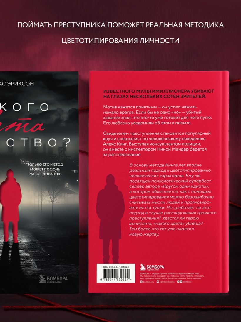 В основу метода Кинга лег вполне реальный подход к цветотипированию человеческих характеров. Ему же посвящён психологический супербестселлер автора «Кругом одни идиоты», в котором объясняется, как с помощью цветотипирования можно безошибочно считывать мысли людей и прогнозировать их поступки. Но сработает ли этот подход в случае расследования громкого преступления? Удастся ли герою вычислить, «какого цвета» убийца? Тем более что тот уже наметил новую жертву.