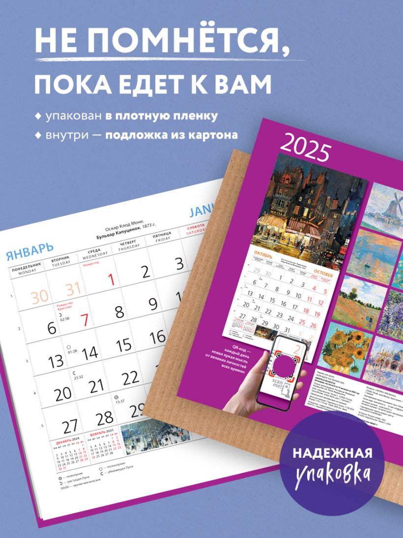 В этом настенном перекидном календаре на 2025 год представлены знаменитые картины великих художников. Повесьте этот календарь в своем доме или на рабочем месте, и он достойно украсит любой интерьер. А календарный блок напомнит о важных событиях года