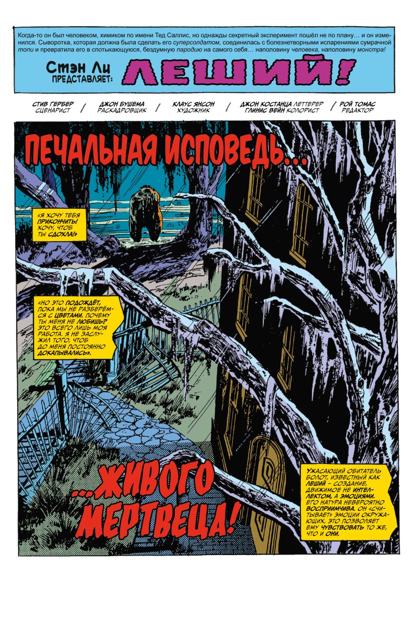 Издание включает выпуски «Инфернальный Леший» #1-3 и «Леший» #12 (1974), написанные Стивом Гербером и проиллюстрированные Кевином Ноуленом и Джоном Бушема, издание дополнено первым появлением Лешего в Savage Tales #1 (1971) за авторством Джерри Конуэйя, Роя Томаса и Грейя Морроу.