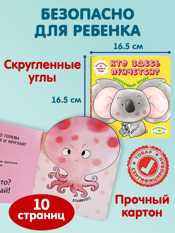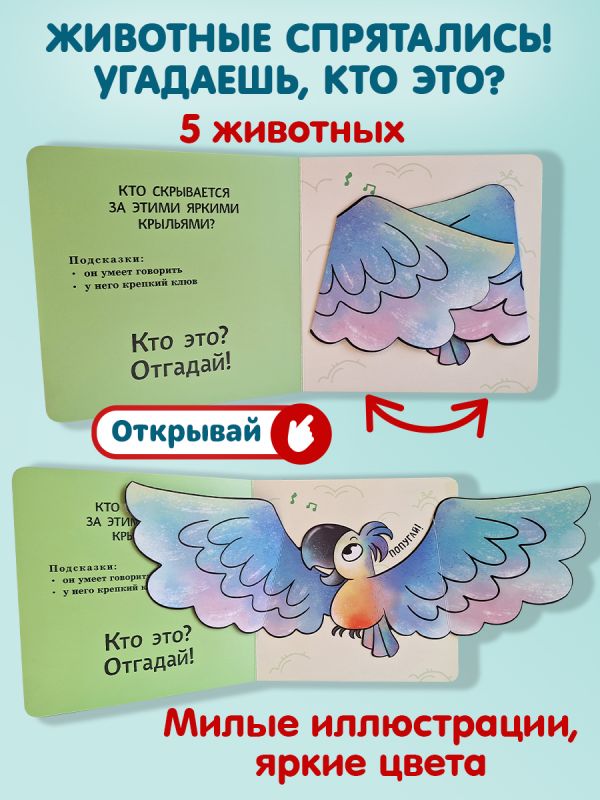 Интерактивная книга-загадка для малышей! Загляните под объёмные элементы — крылья, ушки или лапки — и познакомьтесь с обитателями животного мира! Эта красочно оформленная книжка-картинка превращает чтение в увлекательную игру: малыш может сам открыть створку, чтобы узнать верный ответ на загадку и увидеть, кто же прячется на страничке. А это… сова, коала, осьминог и другие интересные животные!