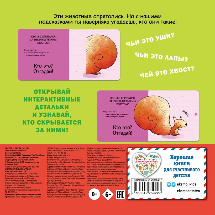 Интерактивная книга-загадка для малышей! Загляните под объёмные элементы — крылья, ушки или лапки — и познакомьтесь с обитателями животного мира! Эта красочно оформленная книжка-картинка превращает чтение в увлекательную игру: малыш может сам открыть створку, чтобы узнать верный ответ на загадку и увидеть, кто же прячется на страничке. А это… панда, тюлень, фламинго и другие интересные животные! Путешествуя по страницам книги вместе с милыми персонажами, малыш познакомится с разными животными, пополнит словарный запас и расширит кругозор. Красочные и детализированные иллюстрации очаруют и ребёнка, и взрослого. Издание прослужит малышу долгое время: твёрдая обложка, скруглённые углы, толстые картонные страницы с матовым лакированием, которые удобно переворачивать маленькими ручками. Только безопасные материалы! Эта развивающая книга отлично подходит детям до 3-х лет. А игра с интерактивными элементами поможет развить мелкую моторику, воображение и память.