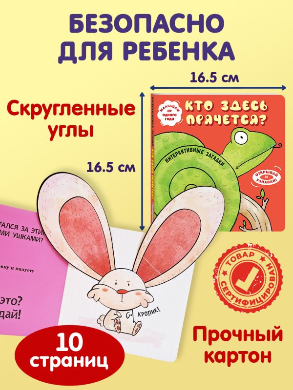 Интерактивная книга-загадка для малышей! Загляните под объёмные элементы — крылья, ушки или лапки — и познакомьтесь с обитателями животного мира! Эта красочно оформленная книжка-картинка превращает чтение в увлекательную игру: малыш может сам открыть створку, чтобы узнать верный ответ на загадку и увидеть, кто же прячется на страничке. А это… ёжик, бобёр, хамелеон и другие интересные животные!