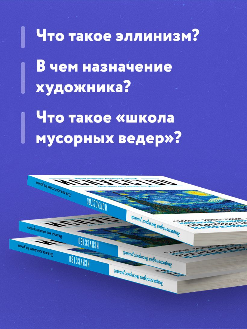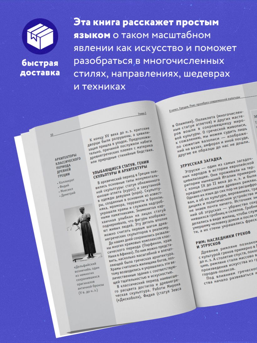 Искусство передает мир во всем его богатстве и многообразии. История искусства — это история достижений человечества. На протяжении многих веков оно развивалось и видоизменялось. Произведения искусства, созданные в разное время, не похожи друг на друга. Разобраться в многообразии стилей, понять замысел творцов крайне сложно, но тем увлекательнее наша задача. Всякого, кто решил узнать об искусстве больше, ждут великие открытия, переживания, радости и новые надежды.