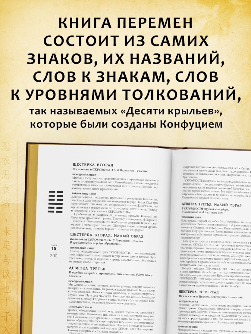 Книга Перемен состоит из самих знаков, их названий, слов к знакам, слов к уровням и толкований, так называемых «Десяти крыльев», которые были созданы Конфуцием.
