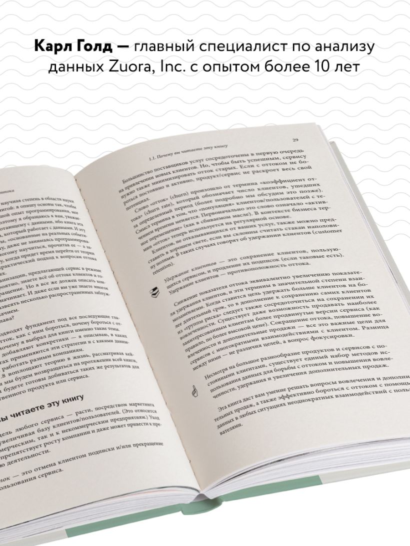 «Всем, кто работает с данными, из всех секторов мировой экономики, от стриминговых медиасервисов до промышленных производителей, стоит изучить книгу Карла Голда. …Никто еще не написал столь же практичного и авторитетного руководства о том, как эффективно фильтровать информацию, чтобы сократить отток. Когда речь идет о бизнесе, связанном с подписками, коэффициенты оттока — это вопрос жизни и смерти!» — Тянь Цуо, основатель и генеральный директор Zuora